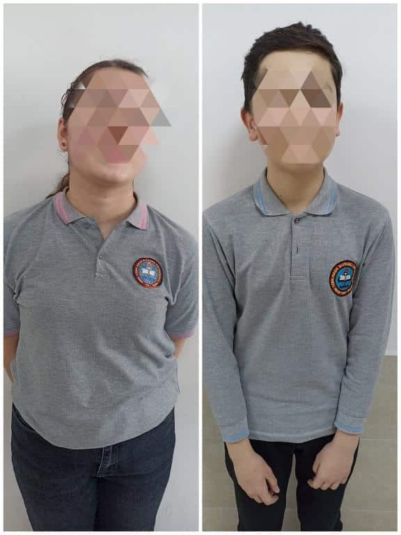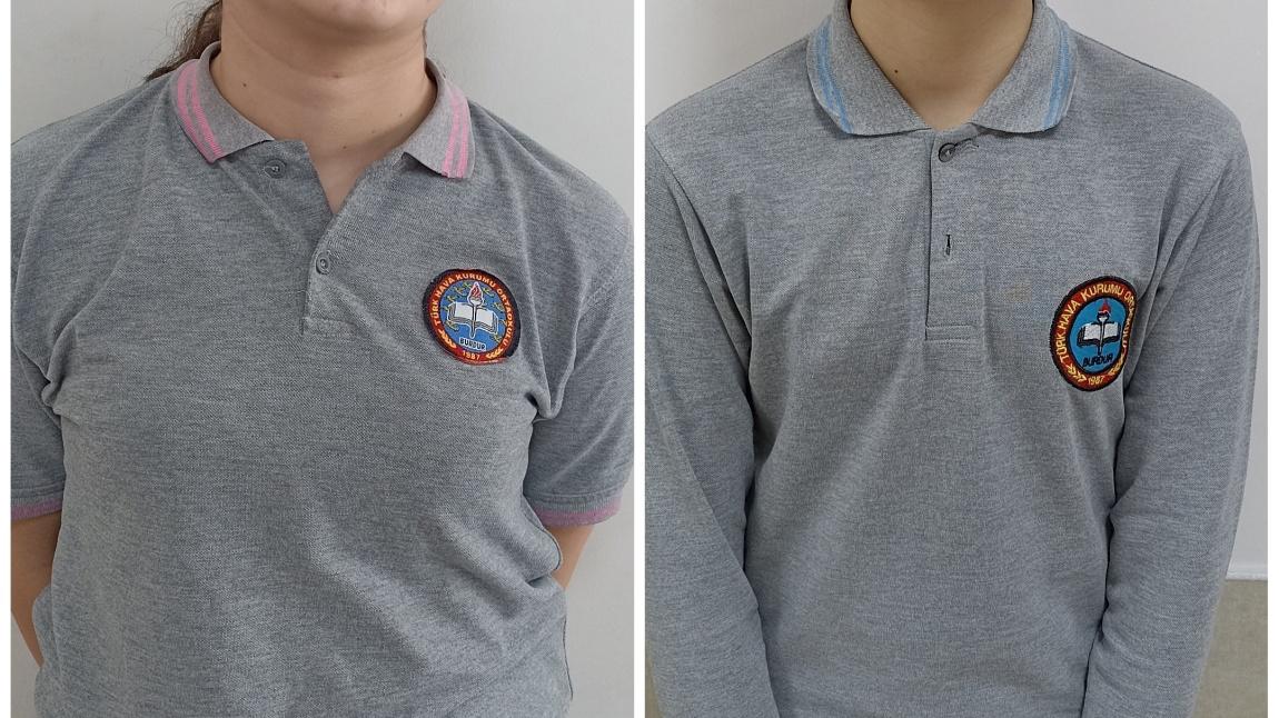 Erkek öğrenciler için yakasında mavi çizgi bulunan okul armalı gri lakos yakalı tişört ve siyah pantolon.